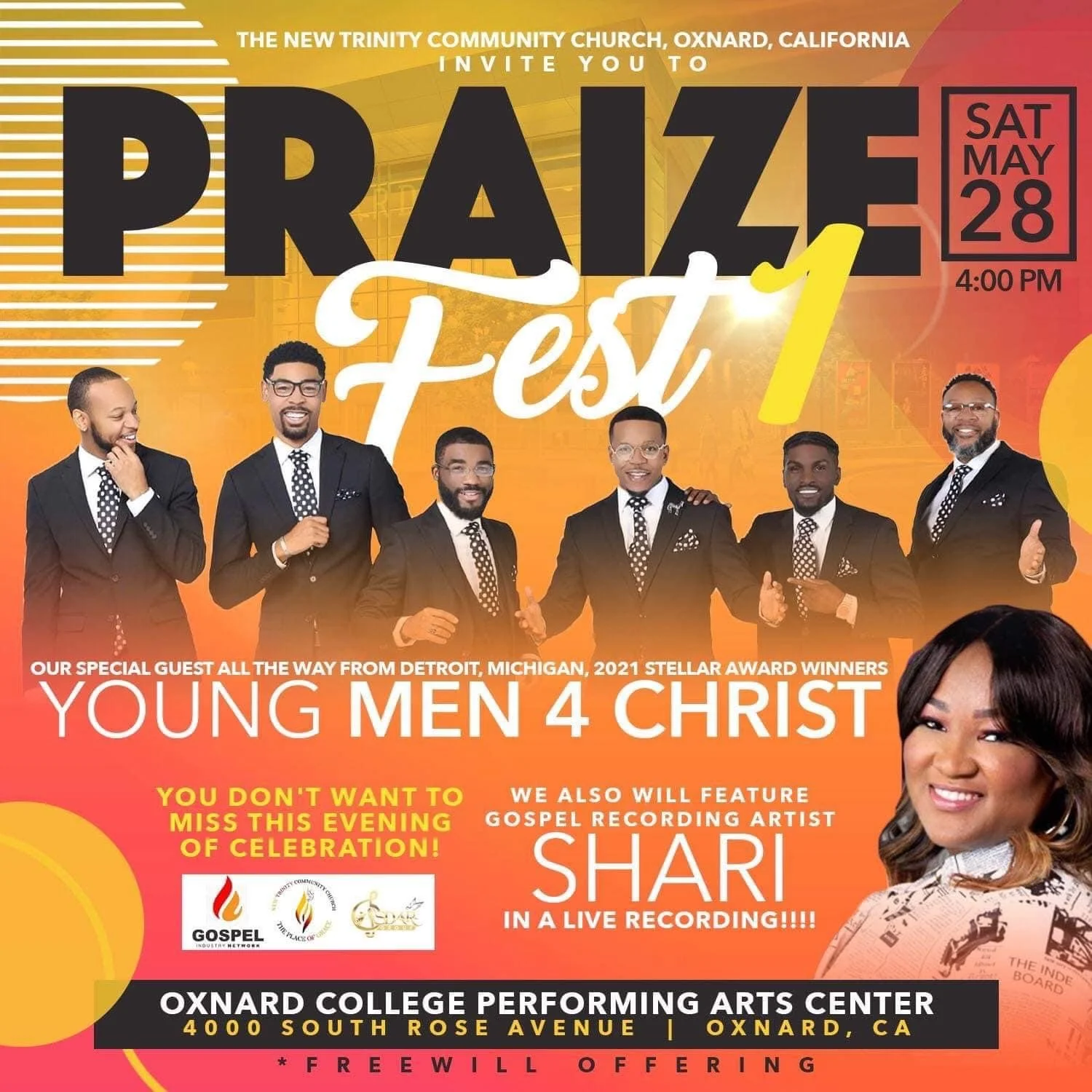 Praize Fest 1 - Shari Live Recording Saturday, May 28, 2022 4:00 PM 7:00 PM Oxnard College 4000 South Rose Avenue Oxnard, CA, 93033 United States (map) Google Calendar ICS